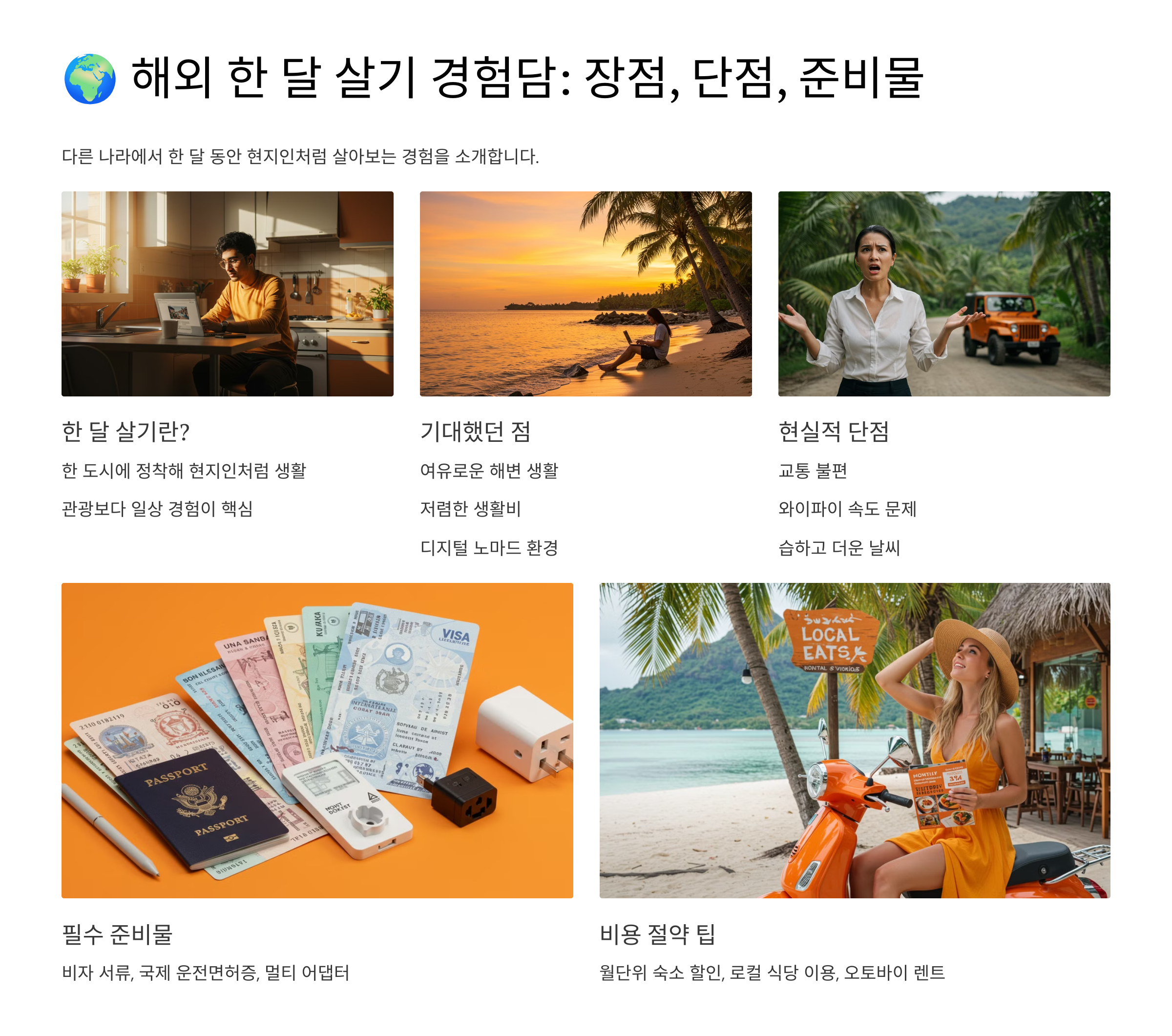 단기 여행보다 비용 절감 효과가 크지만, 숙소, 교통, 인터넷 등 현실적인 문제도 존재합니다.
